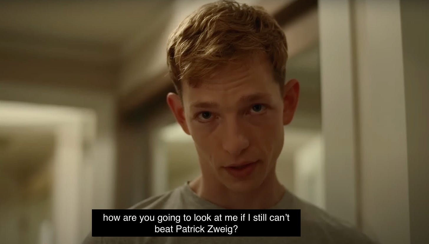 Ten years before their tense showdown in the Challenger, Art and Patrick were doubles partners with a deep friendship that stretched back to childhood. Fresh off a win in the junior tournament at Wimbledon, they meet Tashi Duncan, and sparks fly instantly. Between everyone. Tashi controls Art and Patrick’s attention as deftly as she rules the tennis court. They desperately invite her back to their shared hotel room, both anxious to know who she will pick, and the central love triangle of the film ignites.